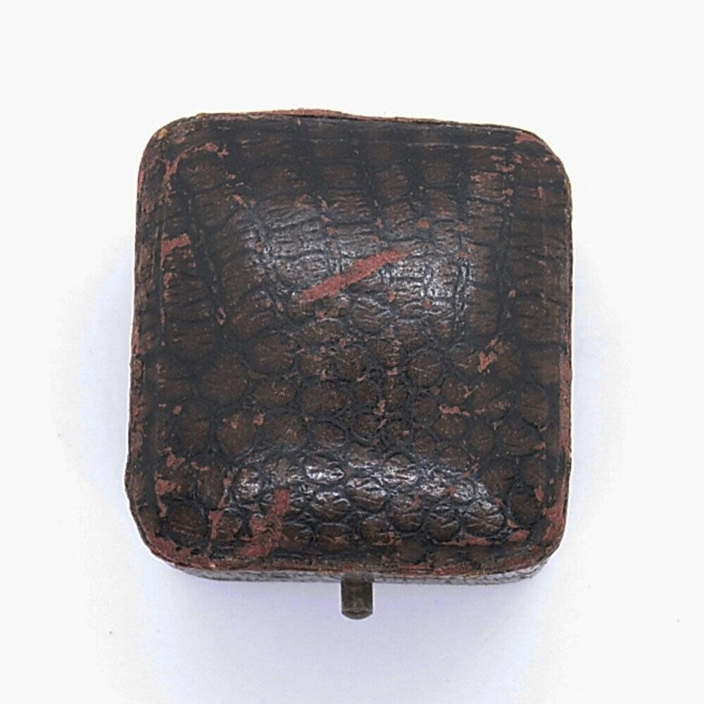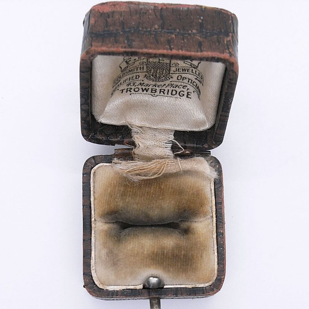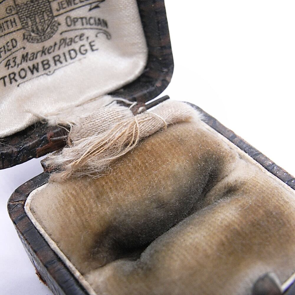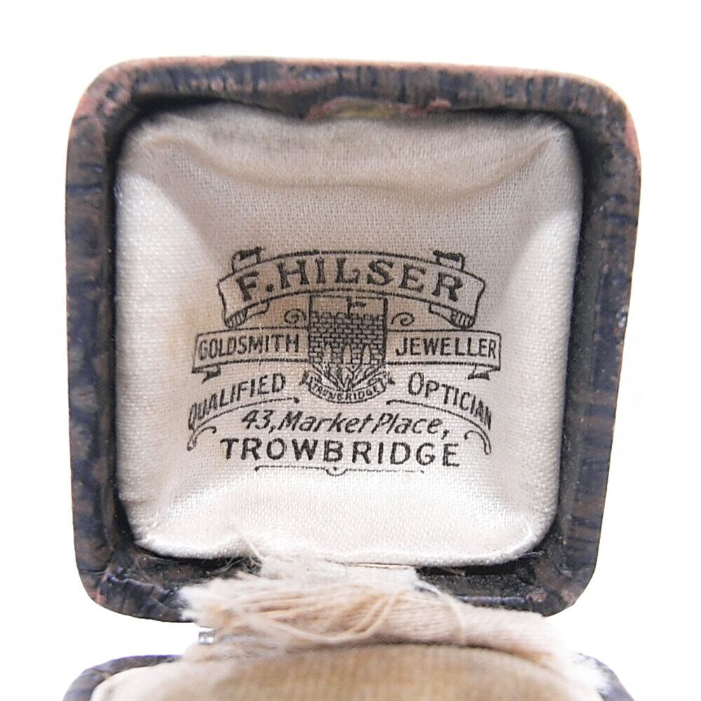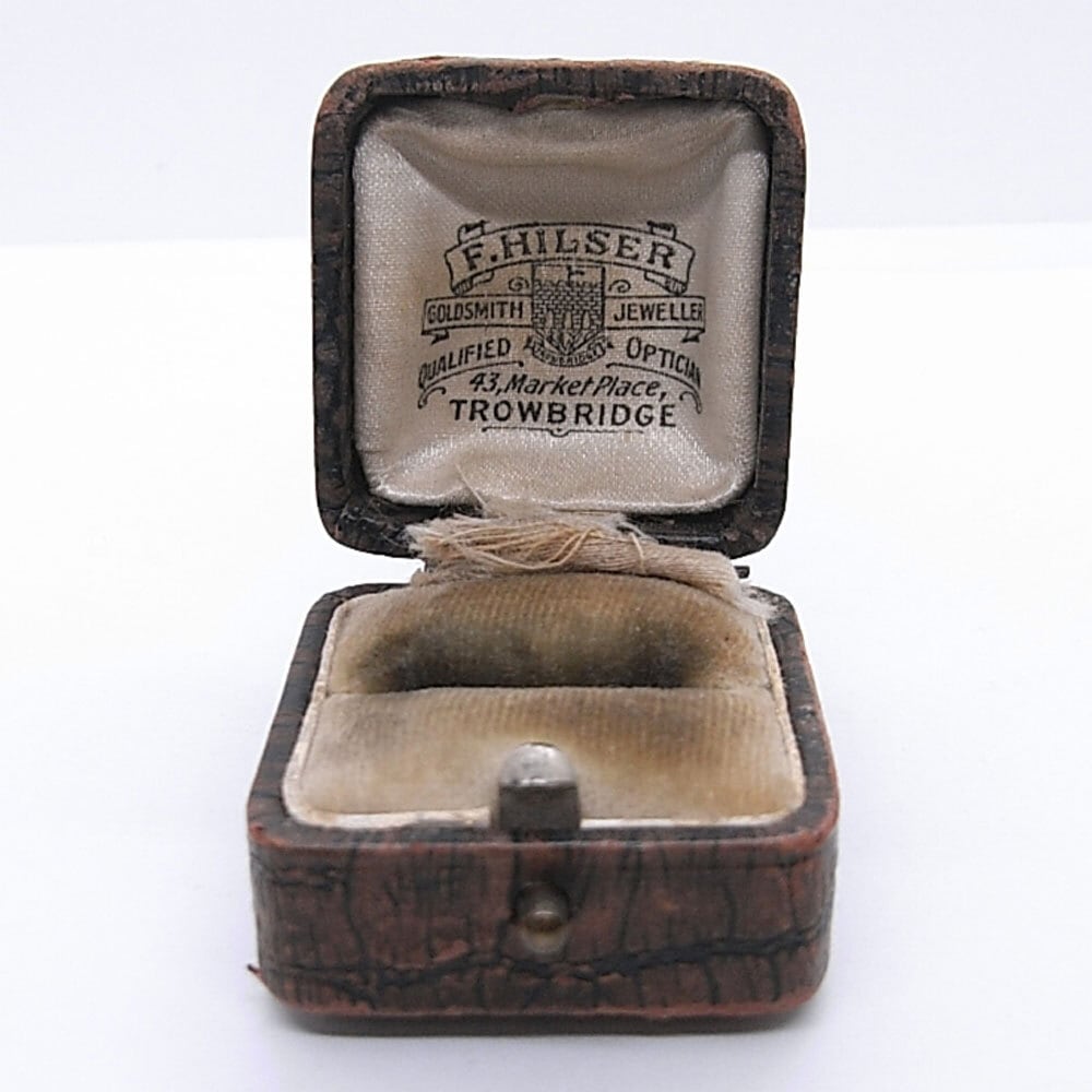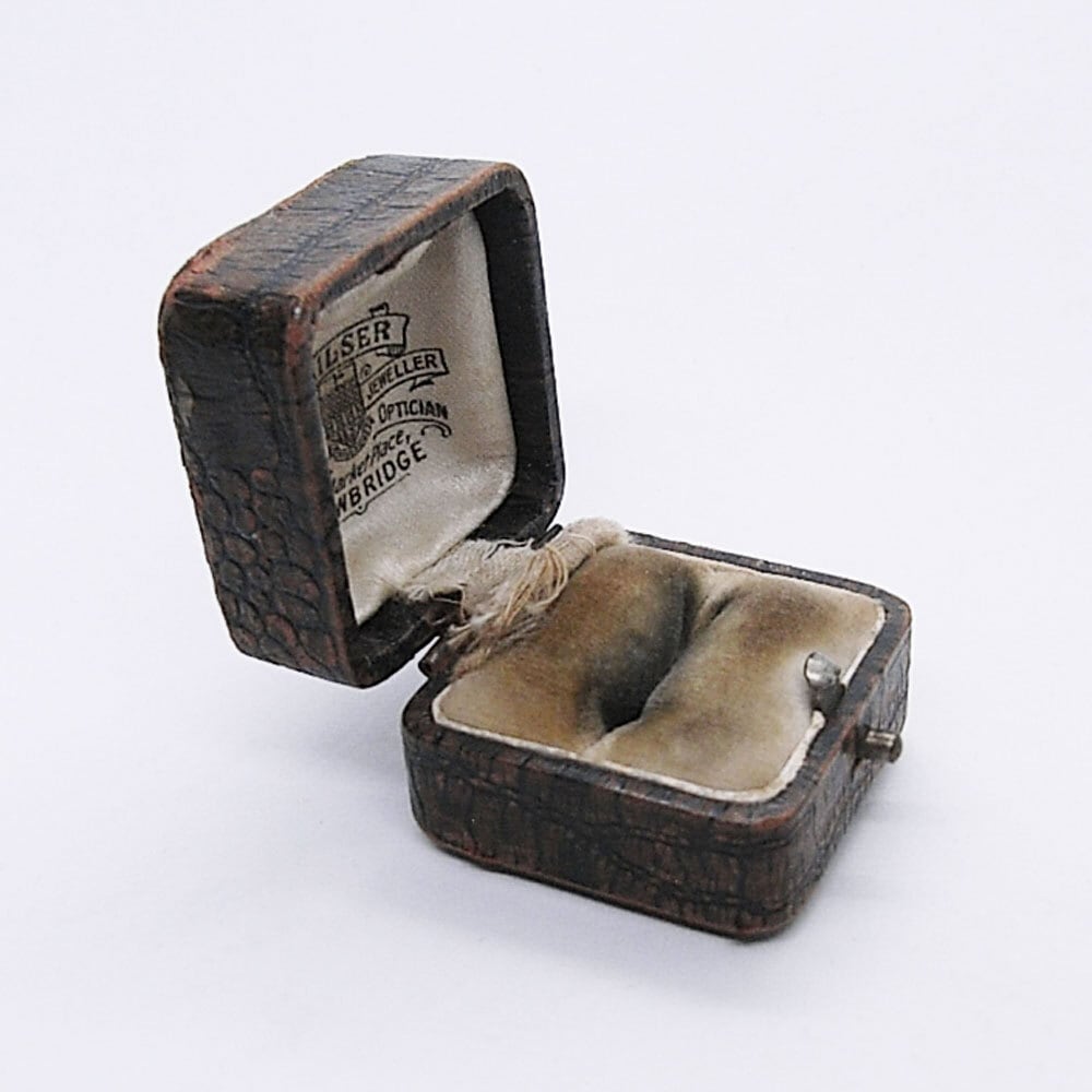 A compact square presentation case featuring a textured brown exterior and softly aged velvet insert. The inside lid retains the original jeweller’s mark, adding authenticity and character.