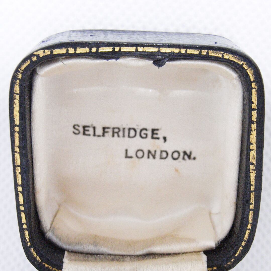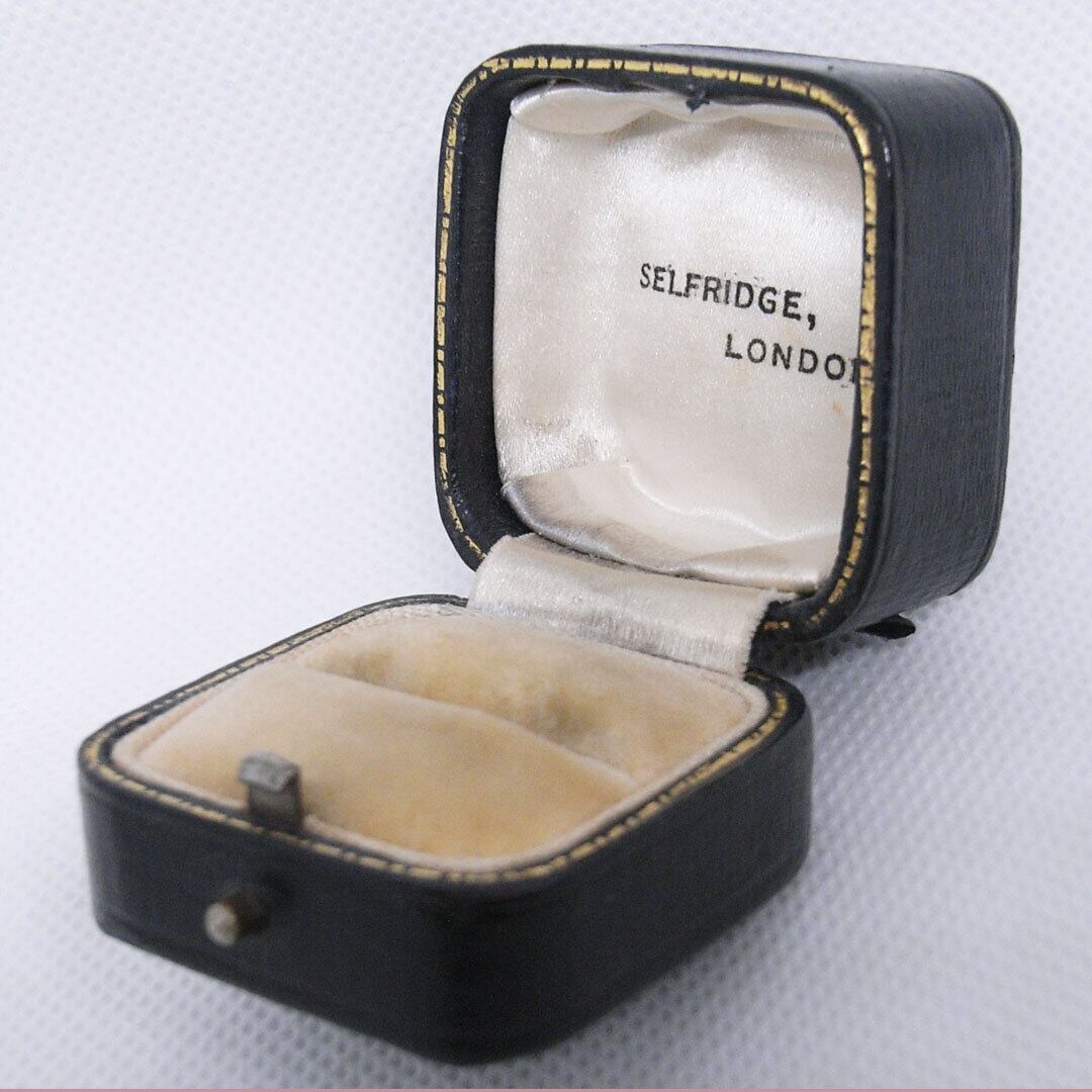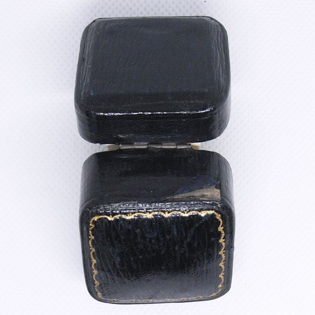 A compact square presentation case featuring a textured brown exterior and softly aged velvet insert. The inside lid retains the original jeweller’s mark, adding authenticity and character.