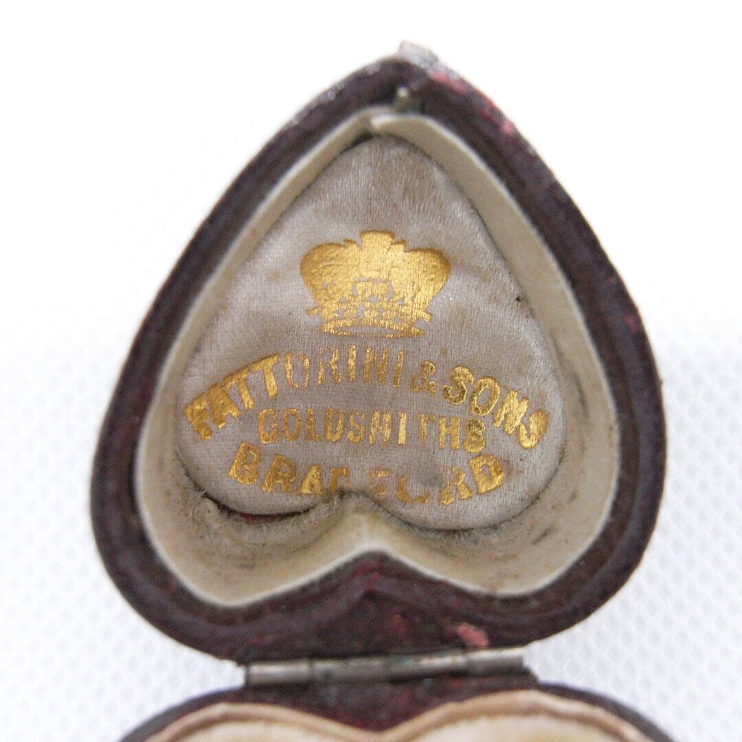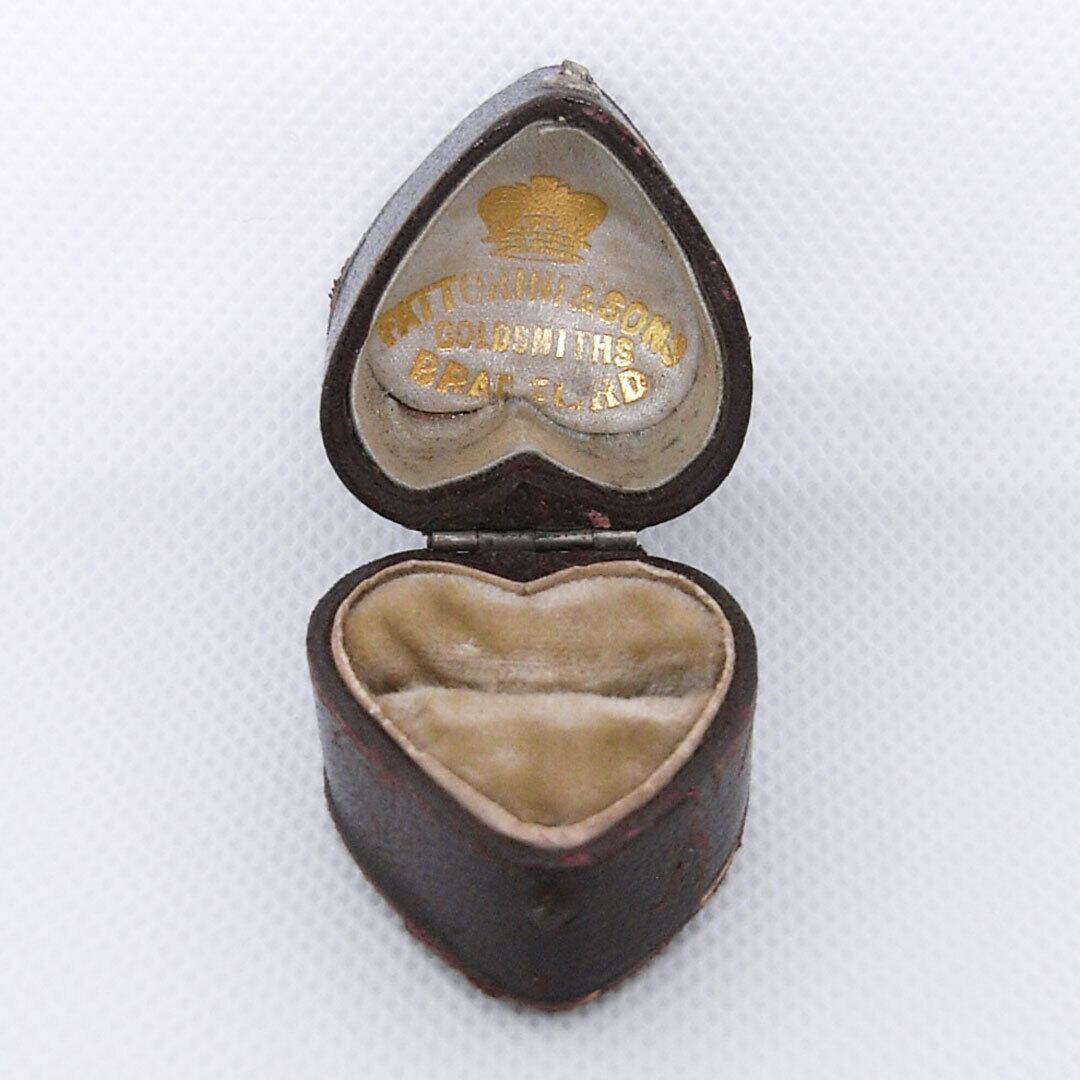 A compact square presentation case featuring a textured brown exterior and softly aged velvet insert. The inside lid retains the original jeweller’s mark, adding authenticity and character.