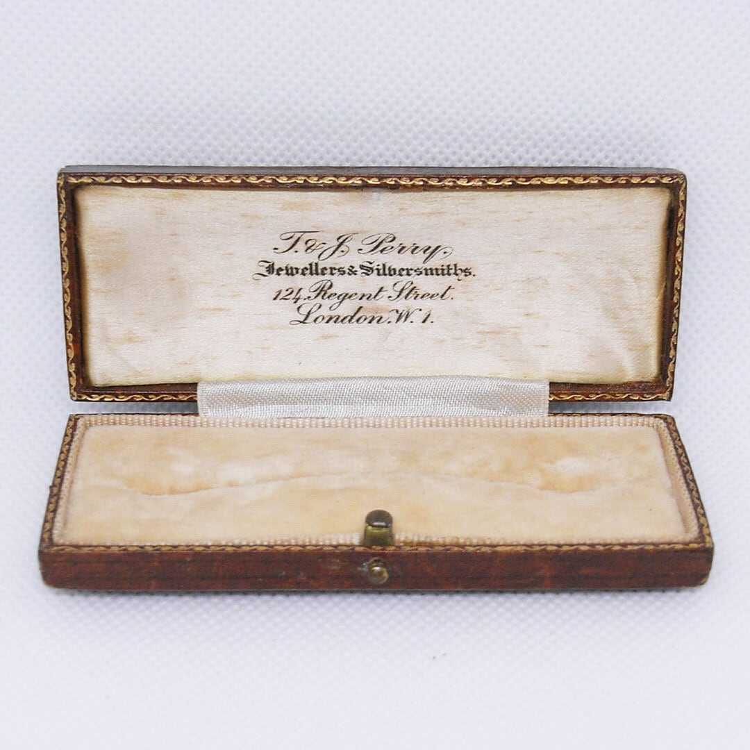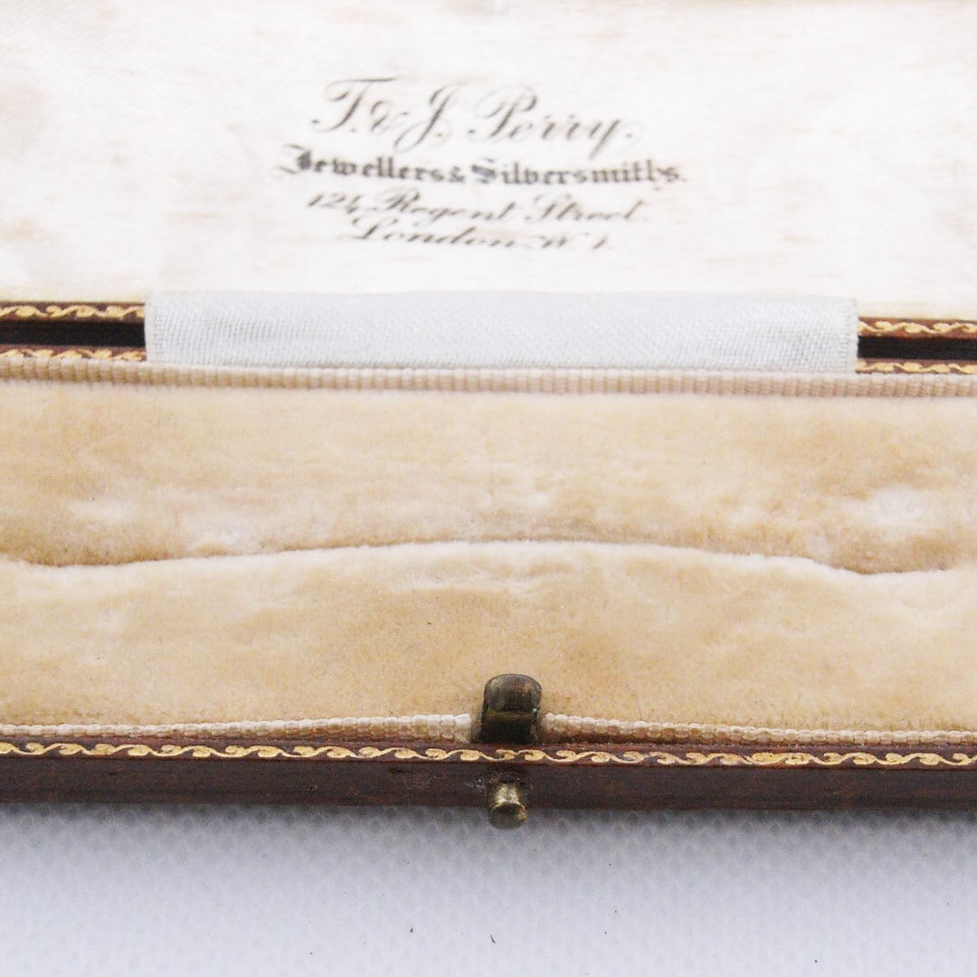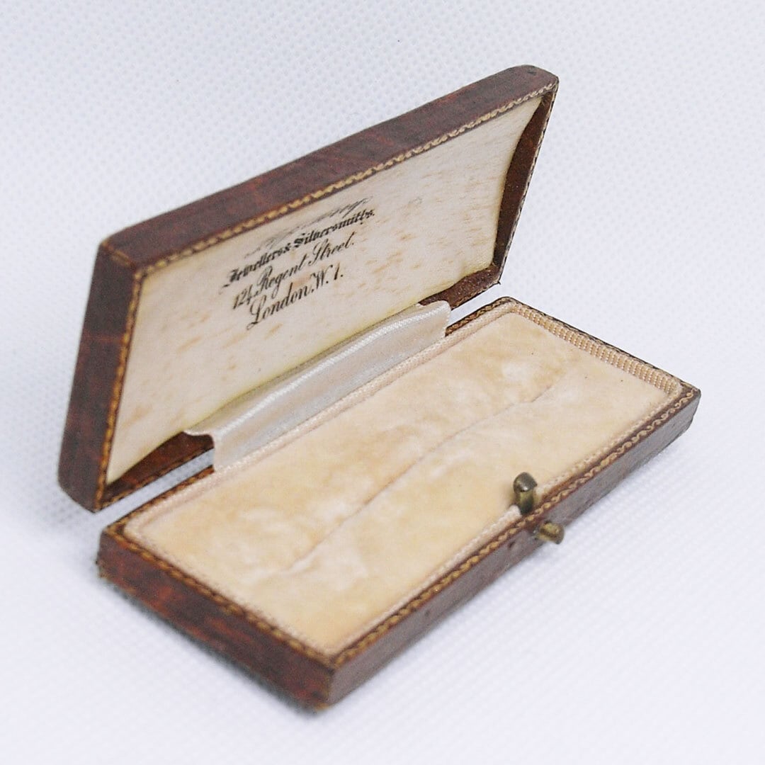 A compact square presentation case featuring a textured brown exterior and softly aged velvet insert. The inside lid retains the original jeweller’s mark, adding authenticity and character.