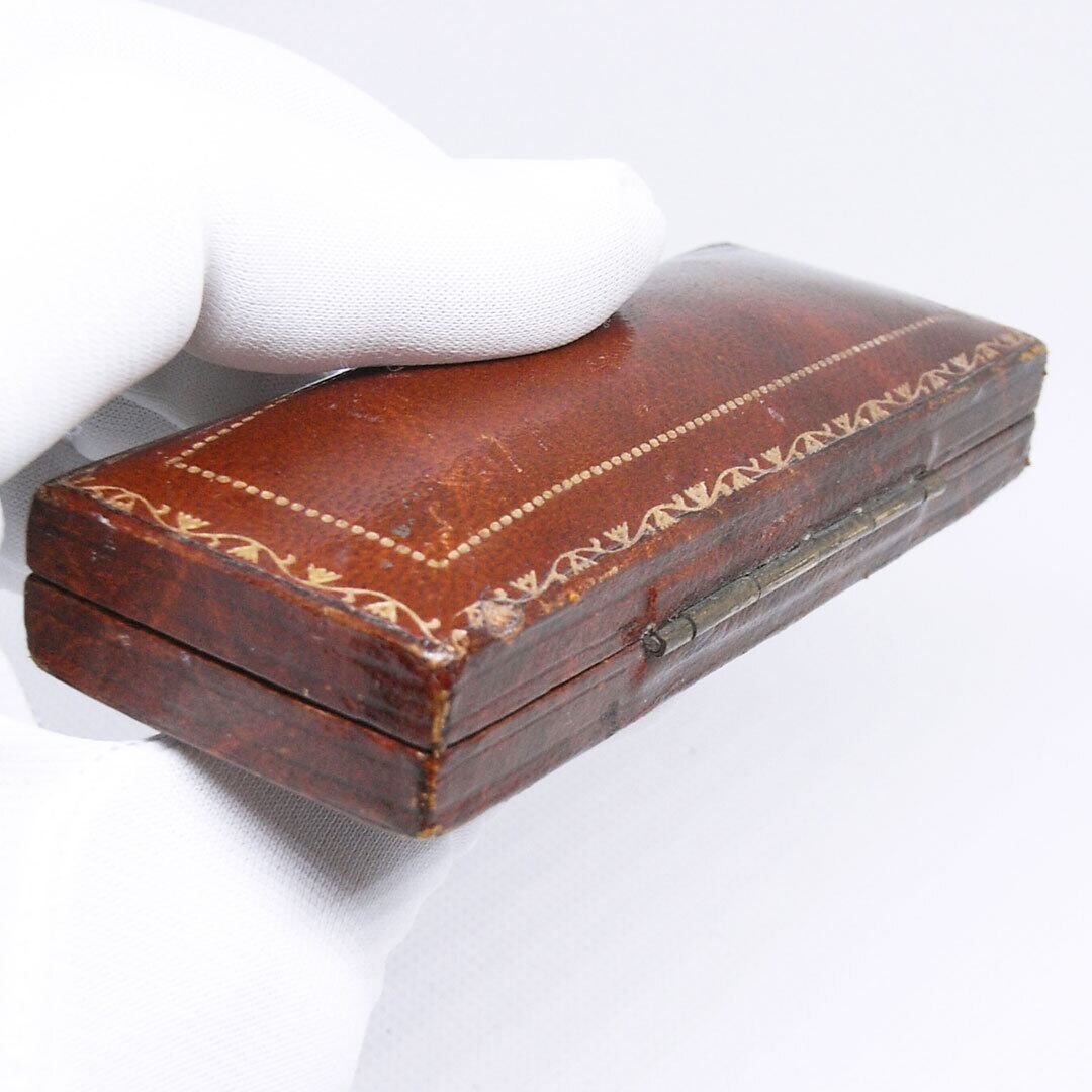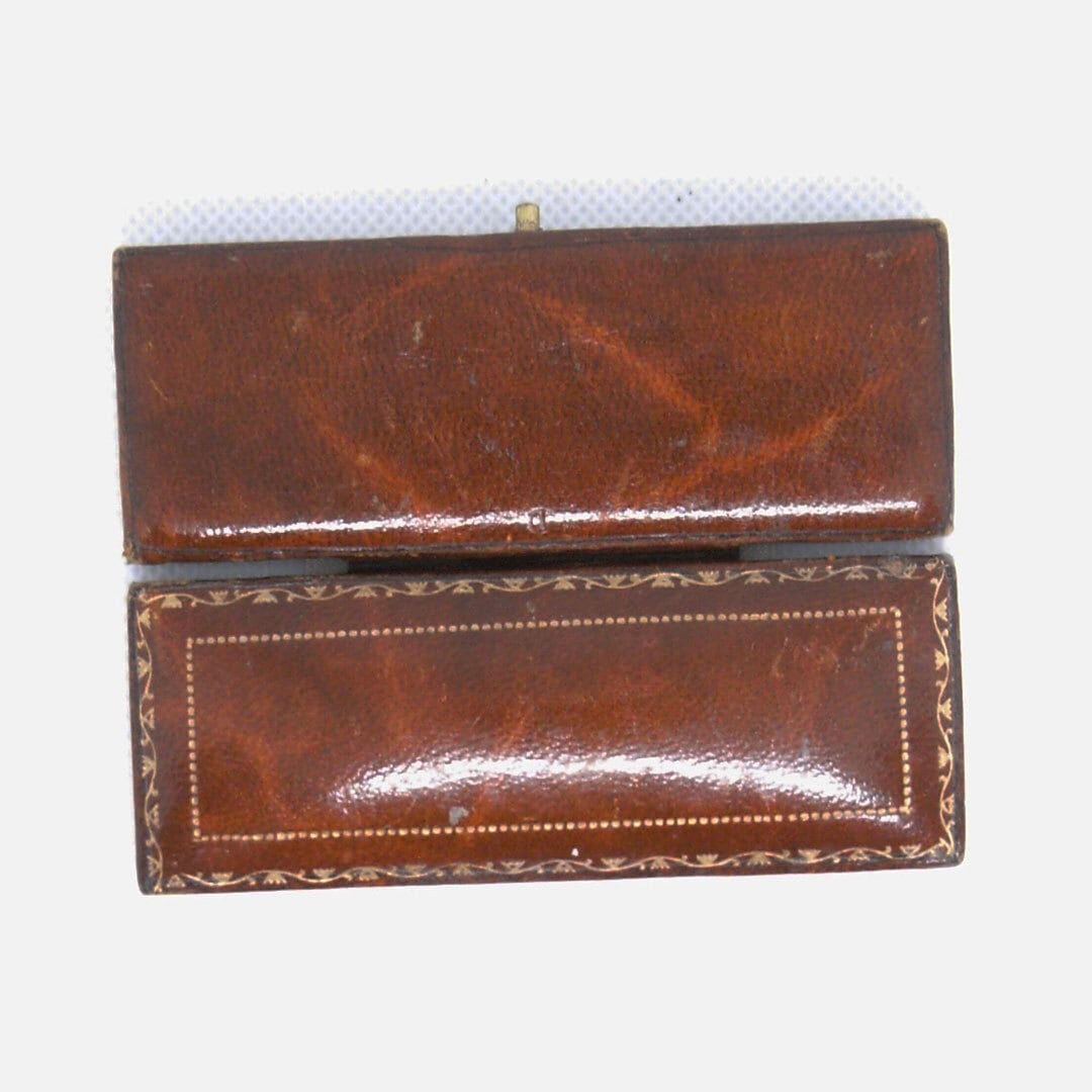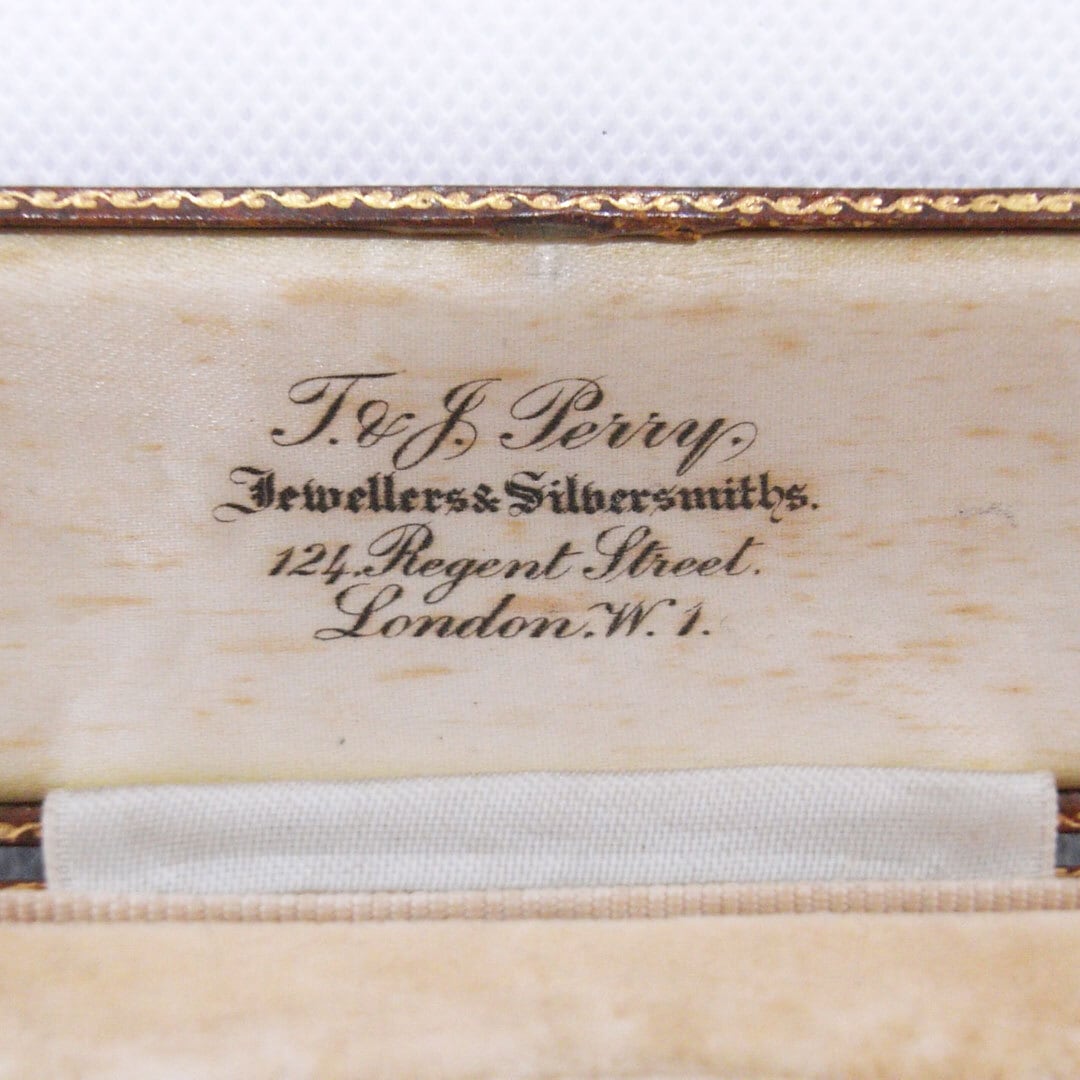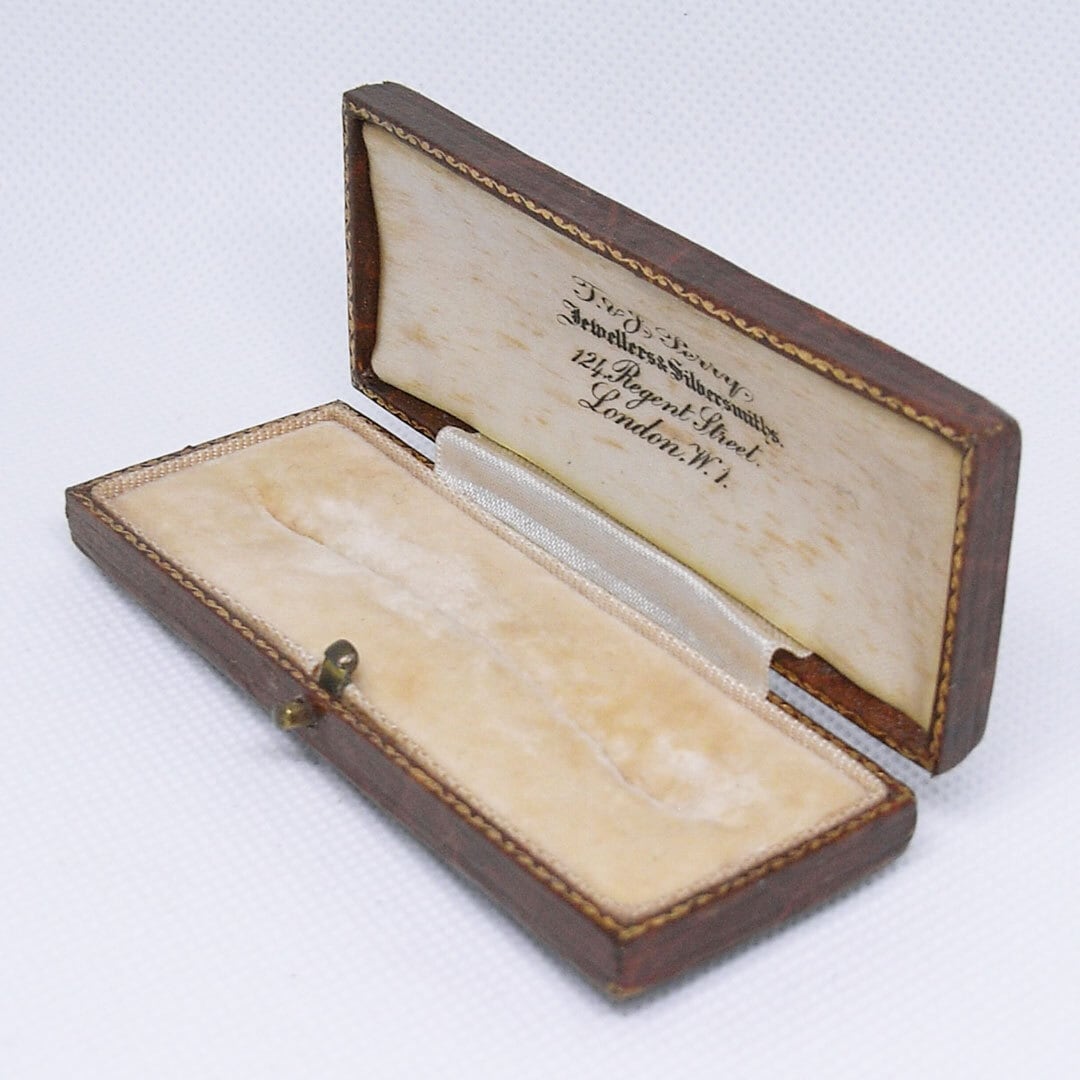 A compact square presentation case featuring a textured brown exterior and softly aged velvet insert. The inside lid retains the original jeweller’s mark, adding authenticity and character.