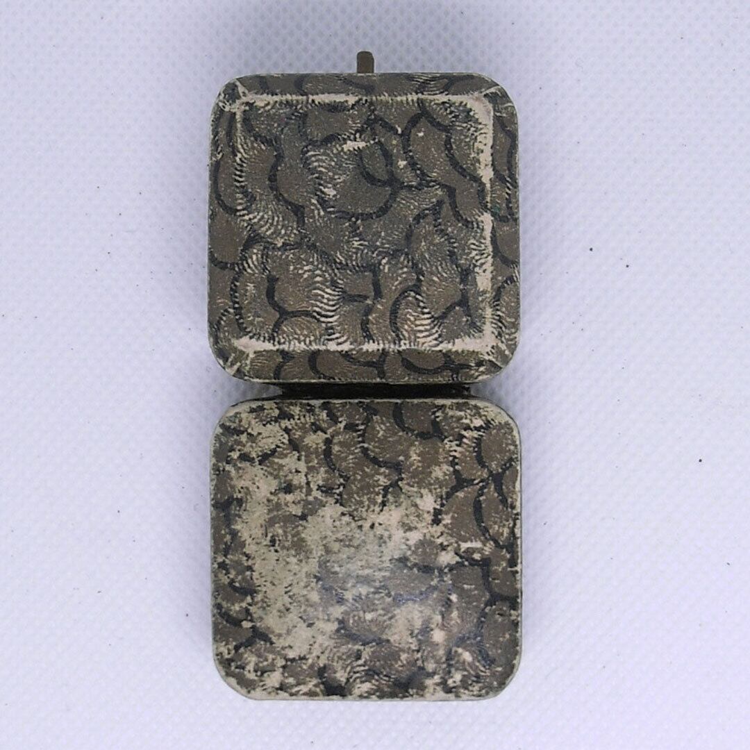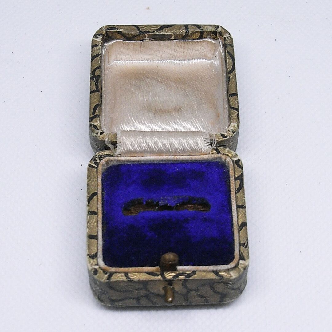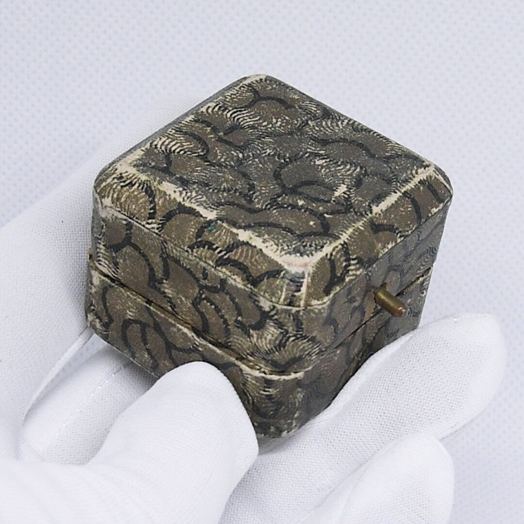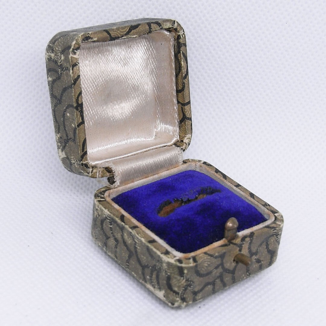 A compact square presentation case featuring a textured brown exterior and softly aged velvet insert. The inside lid retains the original jeweller’s mark, adding authenticity and character.